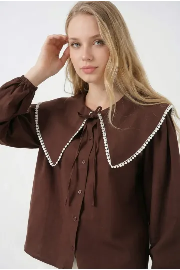 Kadın Kahverengi Bebe Yaka Düğmeli Şık Günlük Gömlek HZL26S-BD1203141