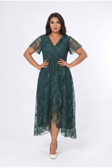 Kadın Yeşil Büyük Beden V Yaka Astarlı Dantel Detaylı Şık Abiye Elbise HZL26S-PR11071