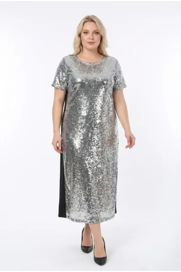 Kadın Gümüş Büyük Beden Payetli Uzun Abiye Elbise Şık Elbise HZL26S-PR11111