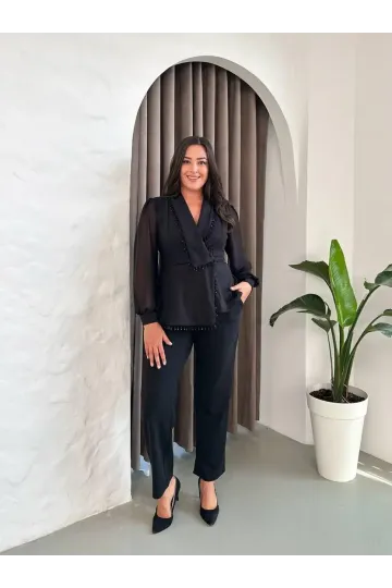 Kadın Siyah Büyük Beden Taş İşlemeli Şifon Kol Alt Üst Abiye Takım HZL26S-PR10151