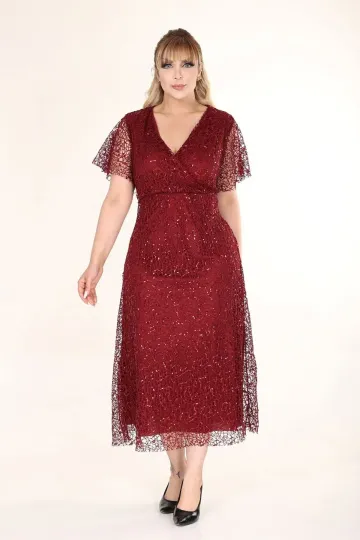 Kadın Bordo Büyük Beden Kruvaze Yaka Payetli Abiye Elbise HZL26S-PR11171