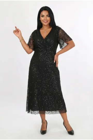 Kadın Siyah Büyük Beden Kruvaze Yaka Payetli Abiye Elbise HZL26S-PR11171