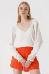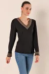 0466 Nakışlı V Yaka Örme Bluz - Siyah