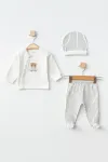 Erkek Bebek Ayı Nakışlı Hırka Pantolon Bere 3 lü Alt Üst Bebek Takımı 0Ay-6Ay