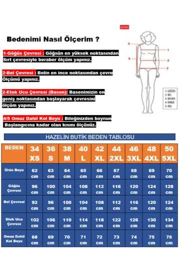• 36 Beden için Ürün Ölçüsü: Ön Boy:63 cm, Arka Boy:67 cm Kol boyu :58 cm Kol Boyu(omuz dahil):69 cm. Kol altı göğüs ölçüsü: 48 cm Göğüs Çevresi: 96 cm Etek : 52 cm Etek çevresi:104 cm