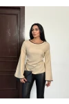 Kadın Bej İp Bağlamalı Biye Detaylı Uzun Kollu Keten Bluz HZL25W-FRY123691