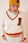 Kadın Ekru V Yaka Crop Armalı Triko Kazak  HZL23W-BD1101351