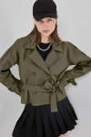 Kadın Haki Kruvaze Yaka Kuşaklı Astarlı Kısa Trençkot HZL25W-BD159701