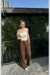 Kadın Kahverengi Cepli Beli Lastikli Bol Paça Keten Pantolon HZL24S-ZK11051