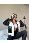 Kadın Pembe Siyah Rugan İçi Astarlı Beli Lastikli Kapüşonlu Crop Peluş Mont HZL24W-BRC144441