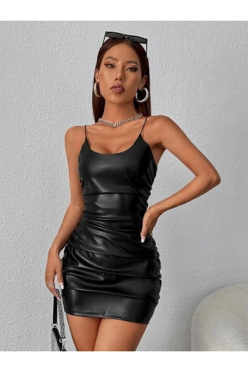 •   Askılı Drape Detaylı Suni Deri Mini Elbise