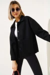 Kadın Siyah Düğmeli Cepli Kısa Kaşe Ceket HZL25W-BD107131