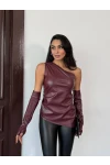 • Tek Omuz Asimetrik Kesim Eldiven Detay Deri Bluz