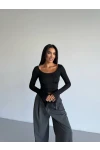 Kadın Siyah Uzun Kollu Arkası Bağlamalı Fit Kesim Crop Bluz HZL25W-FRY122771