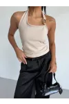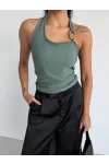 Kadın Yeşil Ottoman Kumaş Halter Yaka Toka Detay Bluz HZL26W-FRY123321