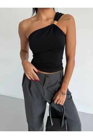 Kadın Siyah Tek Omuz Gold Metal Detaylı Sandy Bluz HZL26S-FRY123821