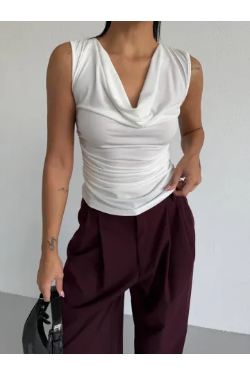 Kadın Beyaz Degaje Yaka Yanlardan Drapeli Sandy Bluz HZL25S-FRY123131