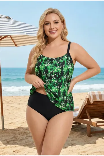 Kadın Siyah Yeşil Desenli Yüksek Bel Toparlayıcı Altlı Büyük Beden Slipli Tankini HZL26S-LC2031