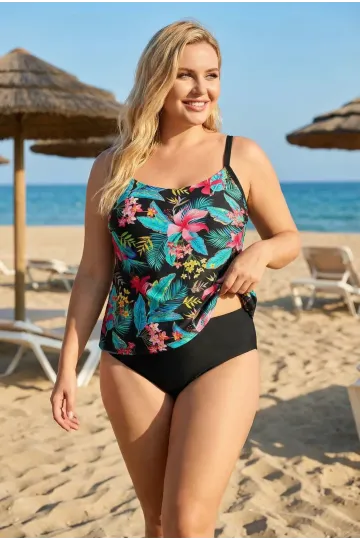 Kadın Siyah Turkuaz Desenli Yüksek Bel Toparlayıcı Altlı Büyük Beden Slipli Tankini HZL26S-LC2031