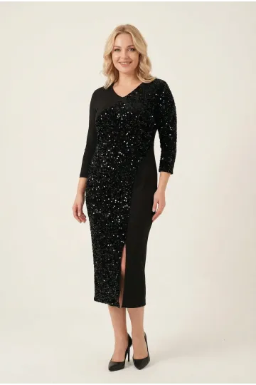 Kadın Siyah Büyük Beden Kruvaze Yaka Pul Payet Detay Abiye Elbise HZL26W-PR10071