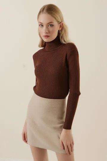 15796 Balıkçı Yaka Fitilli Kazak - Kahverengi