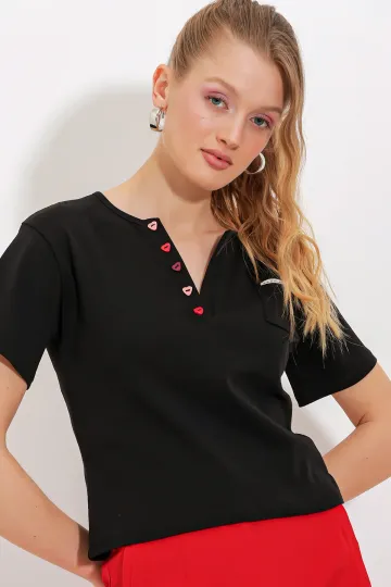 Kadın Siyah Düğme Detaylı Kısa Kol Tişört 903