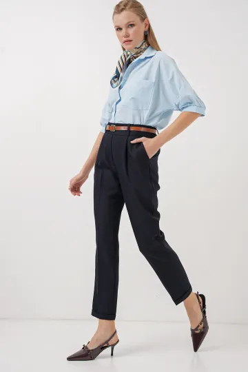 6686 Kadın Pileli Kemerli Kumaş Pantolon - Lacivert
