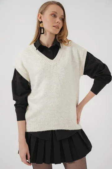 15914 V Yaka Triko Süveter - Ekru