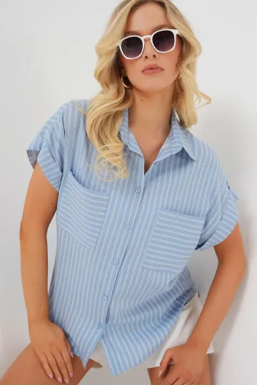 Kadın Kısa Kol Çizgili Oversize Gömlek 20303 - Mavi