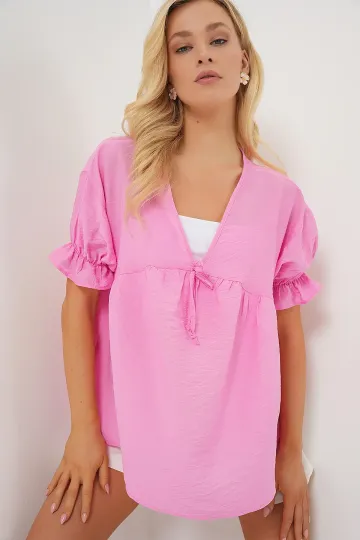 Kadın Önü Bağcıklı Kısa Kol Bluz 962 - Pembe