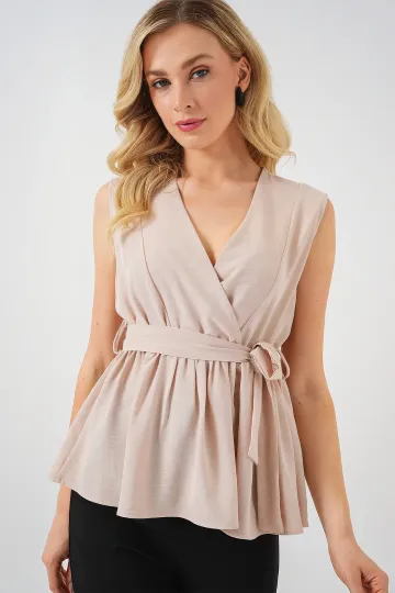Kadın Kruvaze Yaka Kolsuz Bluz 966 - Krem