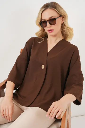 Kadın Kısa Kol Oversize Kimono 5969 - Kahverengi