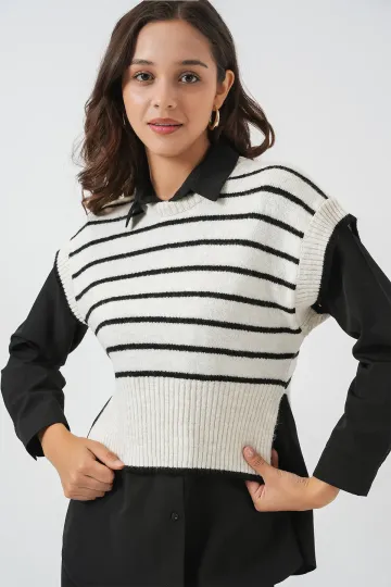 Kadın Çizgili Triko Süveter 15926 - Ekru