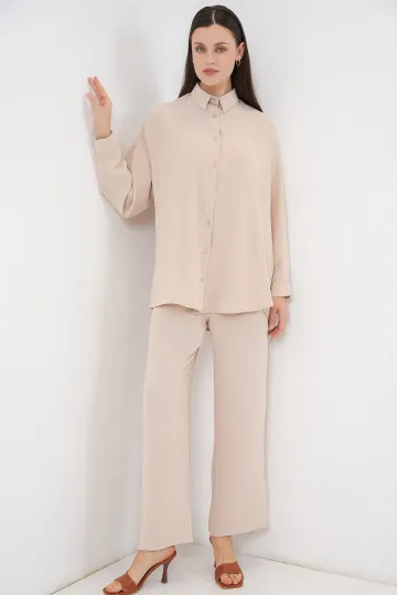 Kadın Gömlek Pantolon İkili Takım 30063 - Krem