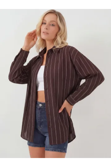 Kadın Çizgili Oversize Gömlek 20293 - Kahverengi