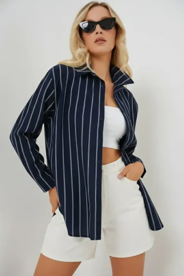 Kadın Çizgili Oversize Gömlek 20293 - Lacivert