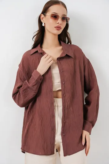 Kadın Uzun Oversize Gömlek 20320 - Kahverengi