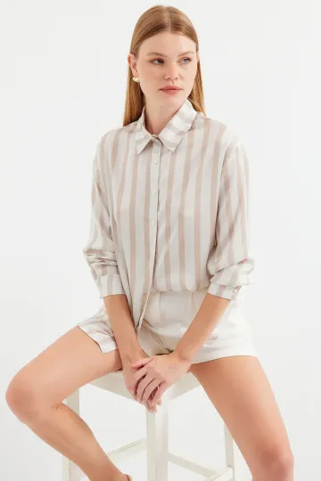 3964 Hafif Dökümlü Saten Gömlek - C. Bej