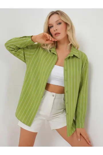 Kadın Çizgili Oversize Gömlek 20293 - E.Yeşil