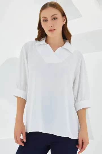 Kadın Beyaz Gömlek Yaka Saten Bluz 0493