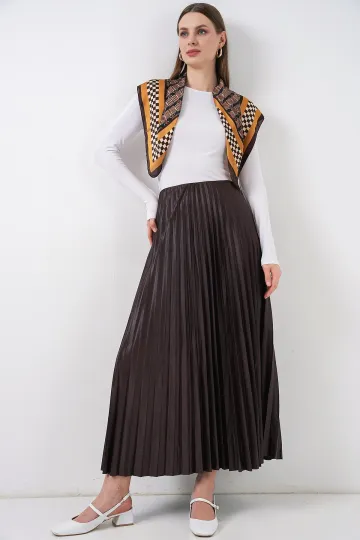 8009 Deri Görünümlü Piliseli Etek - Kahverengi