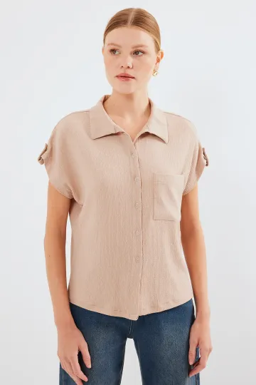 20256 Manşetli Double Kısa Kollu Gömlek - Bisküvi