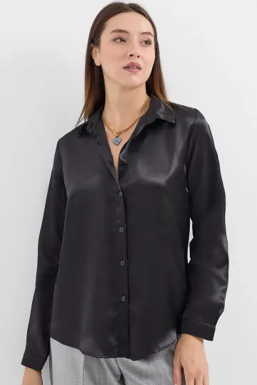 3964 Hafif Dökümlü Saten Gömlek - Siyah