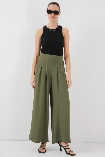 Kadın Geniş Paça Pileli Pantolon 6718 - Haki