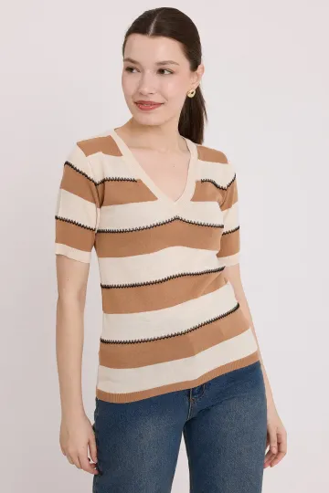 Kadın Bisküvi Krem Çizgili Kısa Kol Bluz 15869