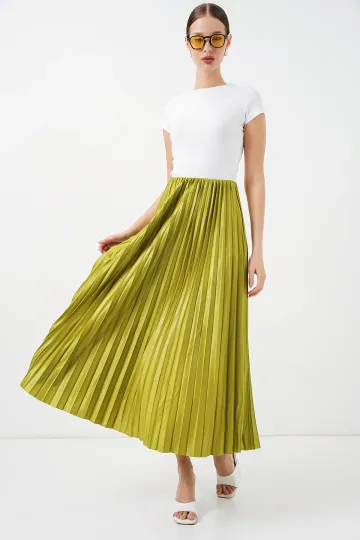 8009 Deri Görünümlü Piliseli Etek - Yağ Yeşil