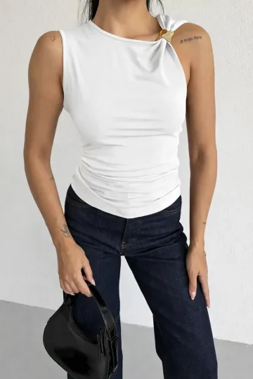 Kadın Beyaz Gold Tokalı Omuz Detaylı Bluz HZL26W-FRY123761