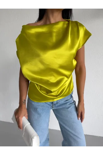 Kadın Fıstık Yeşil Tek Omuz Asimetrik Kesim Saten Bluz HZL26W-FRY121171